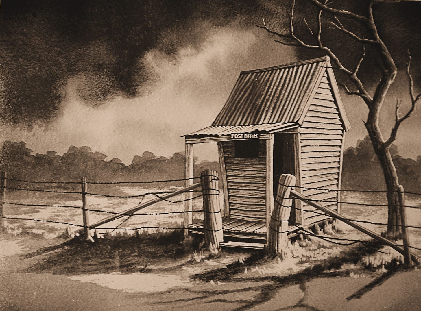 The Watercolour was painted by Miss Thelma Duffton sometime before World War 2 and the more recent picture by Bob Neville, depicts the Backwater Post Office (near Guyra NSW) which operated from 1938 until the early 1950’s